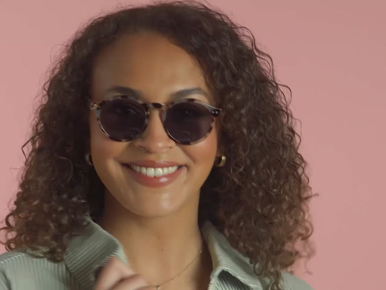 A bold round frame incorporating a shiny, white tortoiseshell finish with silver stud detail. Polarised lenses with full UV400 protection and complete with a grey felt Goodlookers carry pouch for safekeeping.